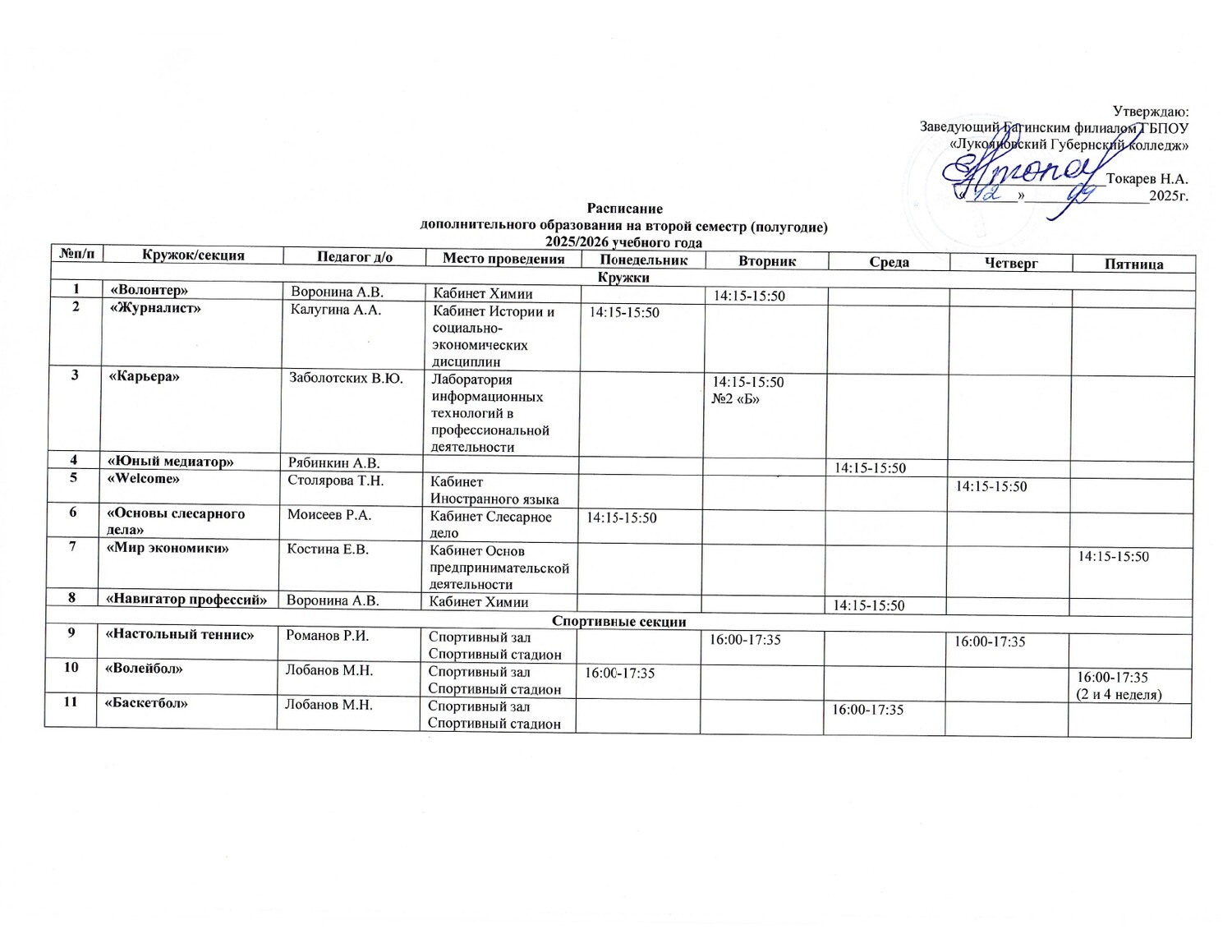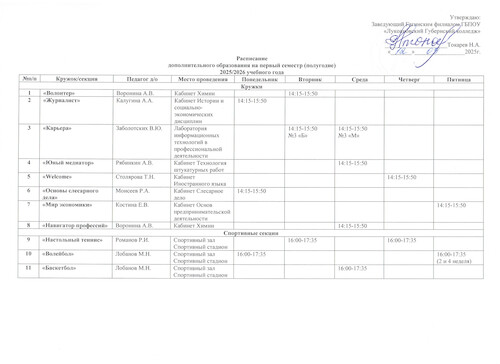 Расписание кружков и секций |